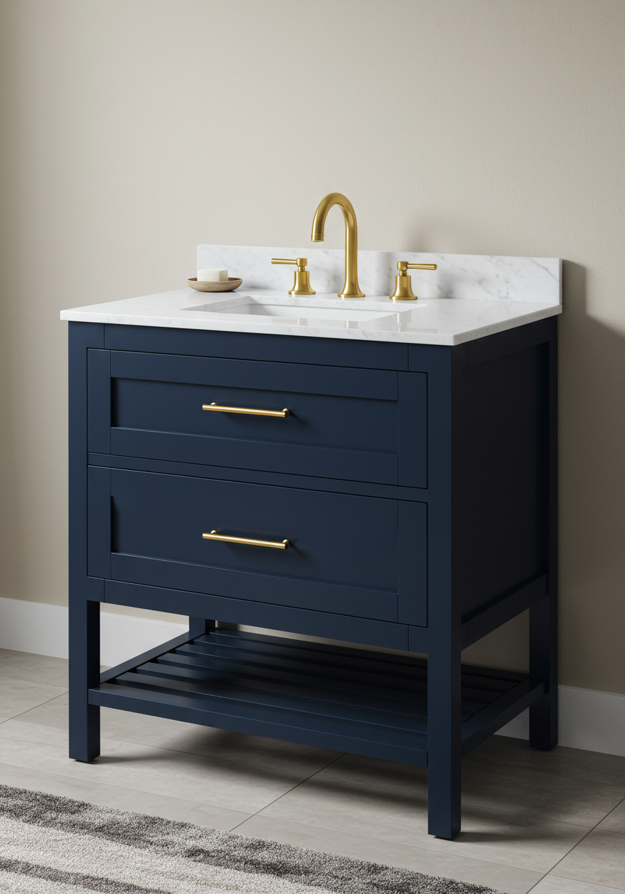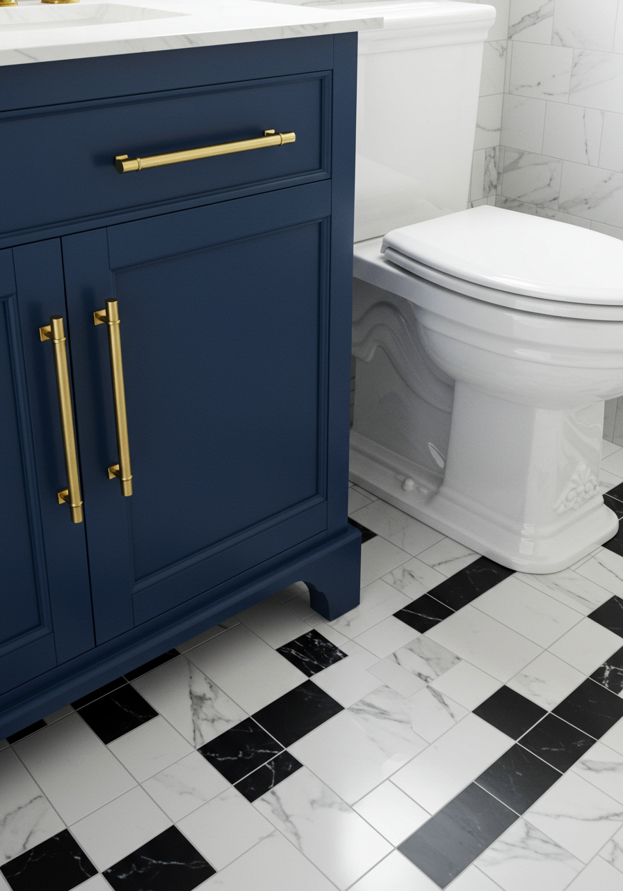 The Enigmatic Show-Stopping Vanity: The centerpiece of the bath is nothing short of a show-stopper - a stunning blue vanity that demands attention. Amidst an achromatic backdrop, this eye-catching feature serves as the focal point, drawing admiration from all who set foot in the room. The balance between simplicity and boldness has been masterfully achieved, leaving visitors in awe.