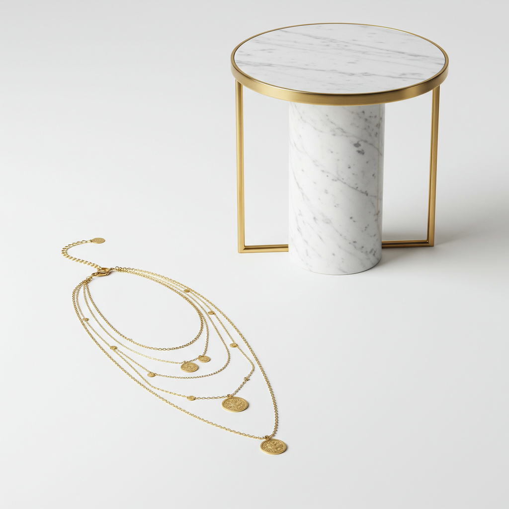 Welcome to this month's edition of Fashion Meets Interiors, where we bring you a breathtaking fusion of chic and modern vibes. Prepare to be inspired as we explore an exquisite collection that combines elegance with contemporary aesthetics. From stunning gold necklaces to CB2's marble side table, every piece is carefully curated to bring timeless class to your home and wardrobe.