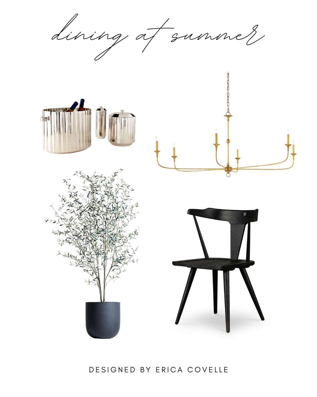 Grounding the room are the Ripley dining chairs by Four Hands from Scout & Nimble. Their classic lines and tailored profile offer a counterbalance to the statement lighting and architectural ceiling, proving that strong design is rooted in restraint. These chairs are elegant without being precious, comfortable without sacrificing style—designed for real homes and real living. A faux olive tree from Crate & Barrel introduces a layer of softness and organic contrast, reminding us that even the most structured spaces benefit from a natural element. Greenery brings life into the room, subtly warming the palette and creating visual balance.